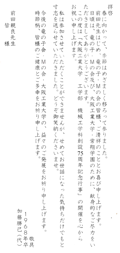 1968年卒 加藤勝己(陽康)様から、下記お手紙を添えて、機械工学科創設75周年を記念